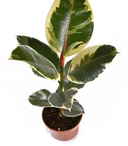 - Foliage: Thick, shiny, oval-shaped leaves. Common varieties are deep green or burgundy, while variegated cultivars feature green, cream, and white patterns.